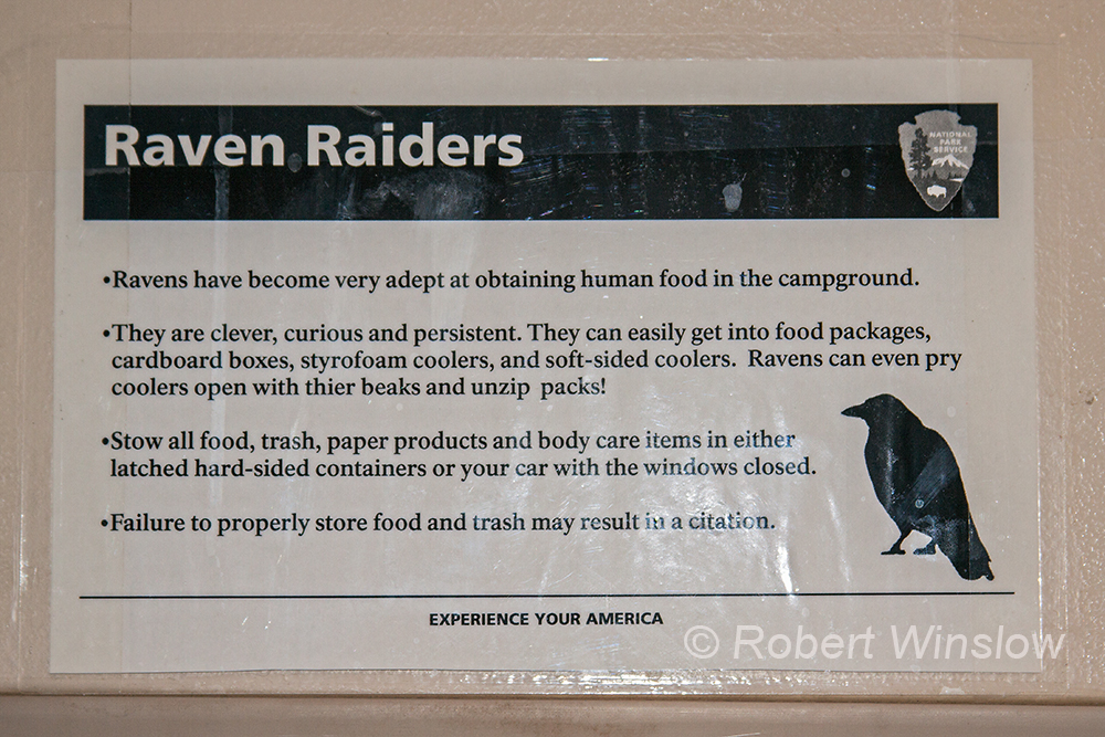 I photographed the Raven Raiders sign during one of my visits to Yellowstone in the winter. Apparently, while snowmobilers were off watching Old Faithful or inside eating, the Ravens would unzip the saddlebags on the snowmobiles and help themselves to whatever was inside.