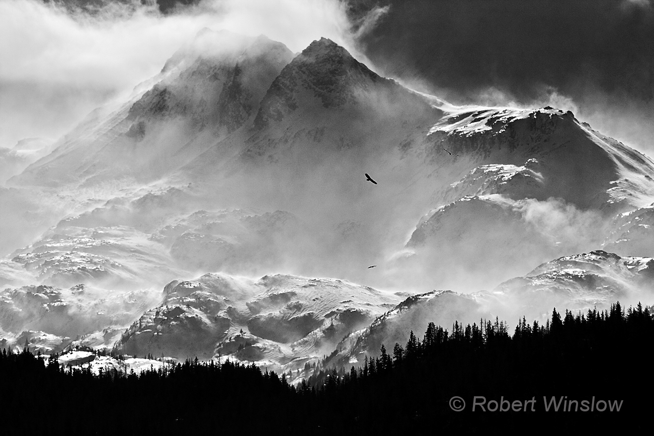 One of the eagles might not be that easy to see. It is flying toward the camera. If you create an imaginary tic-tac-toe grid on your screen, you will find the third eagle just below and to the right of where the lines intersect in the upper right-hand corner