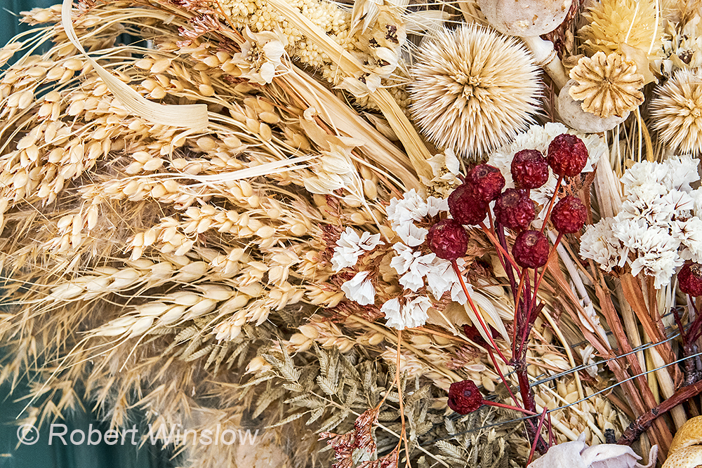 This is a detail of a “Holiday” wreath that I hang on my door in the winter. It is two years old now and still looks great. I bought it at a local organic food store and am pretty sure that it was made locally. I really admire the care, craftsmanship and imagination that went into creating it.