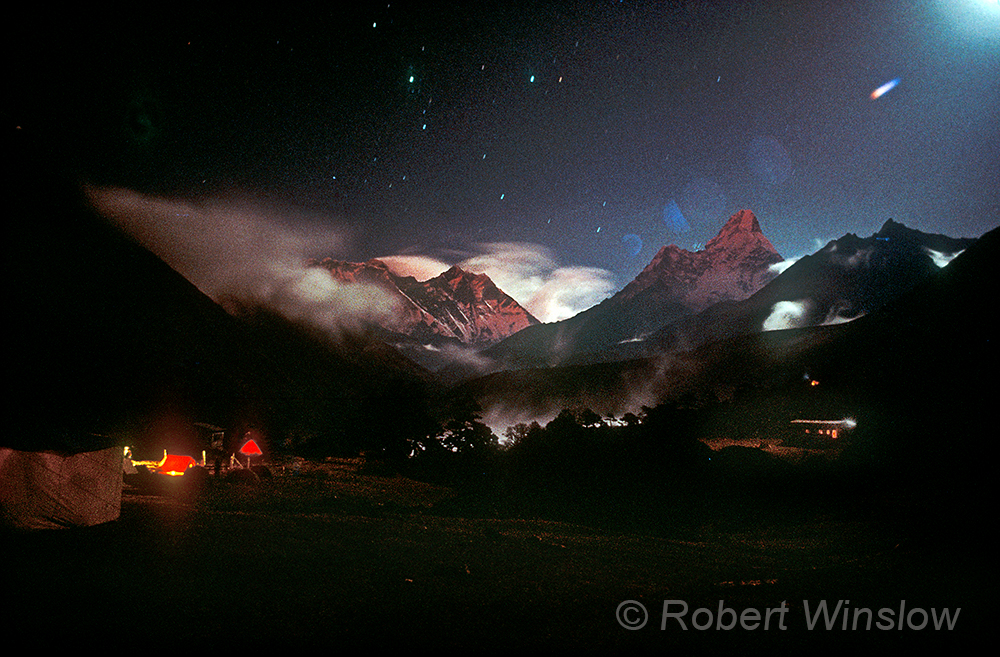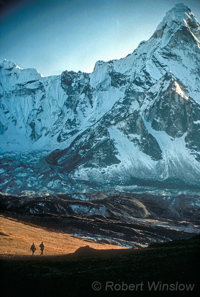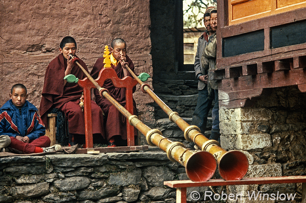 We camped for about a week outside the Thyangboche Buddhist Monastery during a festival called Mani Rimdu. Every morning about 4 A.M. they would play these horns. Usually, at this location in the mountains and at that time of the morning the entire area was engulfed in a misty cloud…..like a dense fog. Imagine lying in your sleeping bag inside your tent inside of a cloud….floating in and out of consciousness……. half awake….. half asleep….. and hearing these horns being played…. It was very very eerie, other worldly, transformative and wholly peaceful.