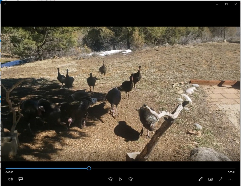 This morning when I got home from town, there were a dozen wild turkeys under Grandmother Tree. I hadn’t seen any turkeys in months and at that time it was only 2 or 3. I decided to go out and see what they would do and attempt a video with my cell phone…..Anyway, it doesn’t appear that I can post a video on this web site so here’s a frame from the video.