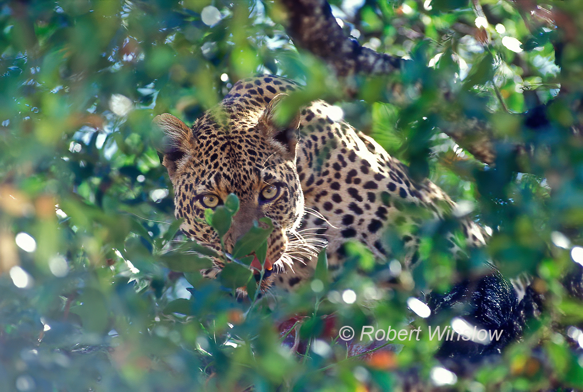 Here’s another “I can see you” photo. This image was taken many years ago at the Leopard Gorge in the Masai Mara. If I remember correctly, this is the famous Half-tail Leopard. She was up in a tree with a kill and I took this photo looking straight up through the roof hatch of the safari vehicle.