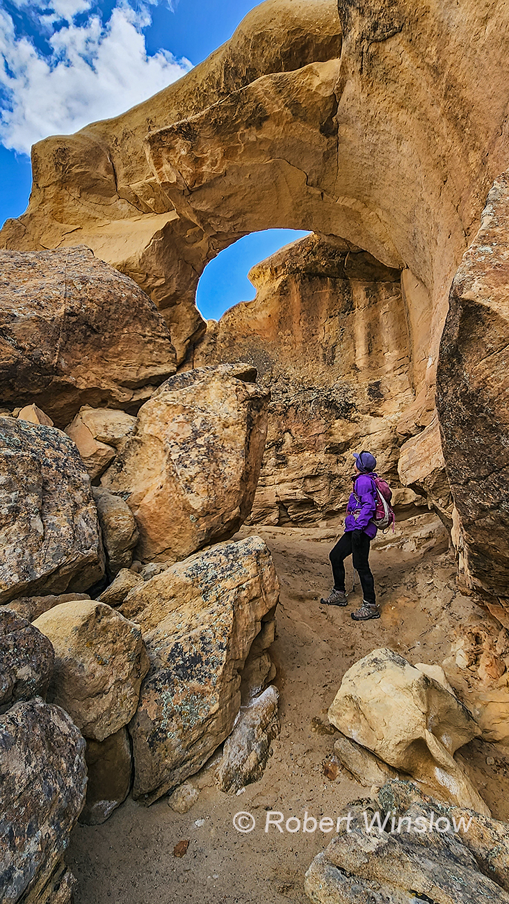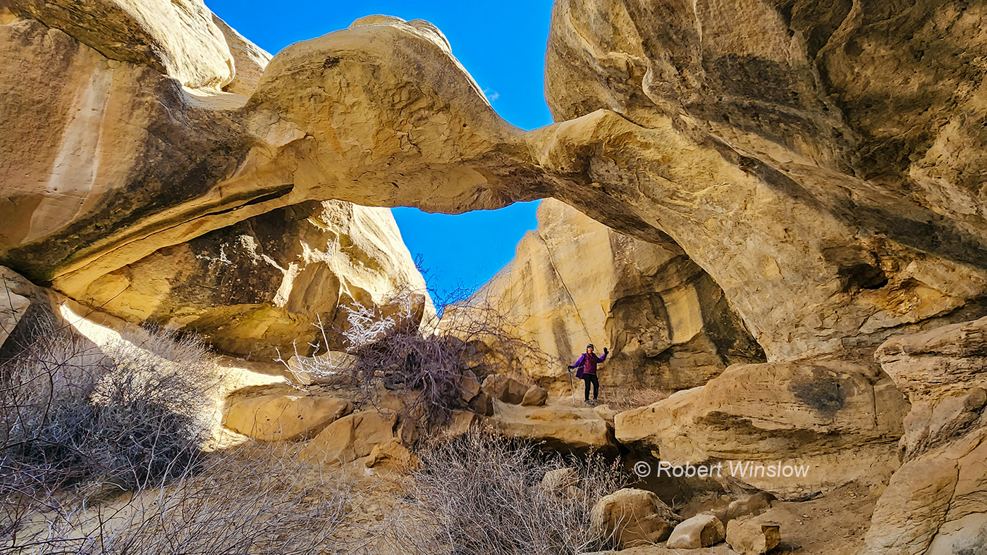 My friend, Mary and I explored Ditch Canyon down in New Mexico. The road was very rutted so we eventually parked the car (not many opportunities to do so) and then hiked (no trail) to find two known arches. We also found a couple of others that were not documented. Optopus Arch 29 foot span Cedar Hills Arch 30 foot span