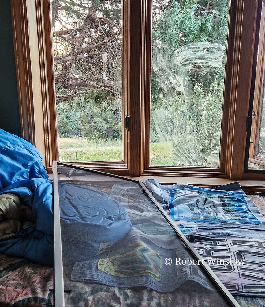 When I woke up Saturday morning, I discovered that a bear had pushed in a window screen and left muddy artwork on some of my windows. Thankfully, it did not try to rip the window open.