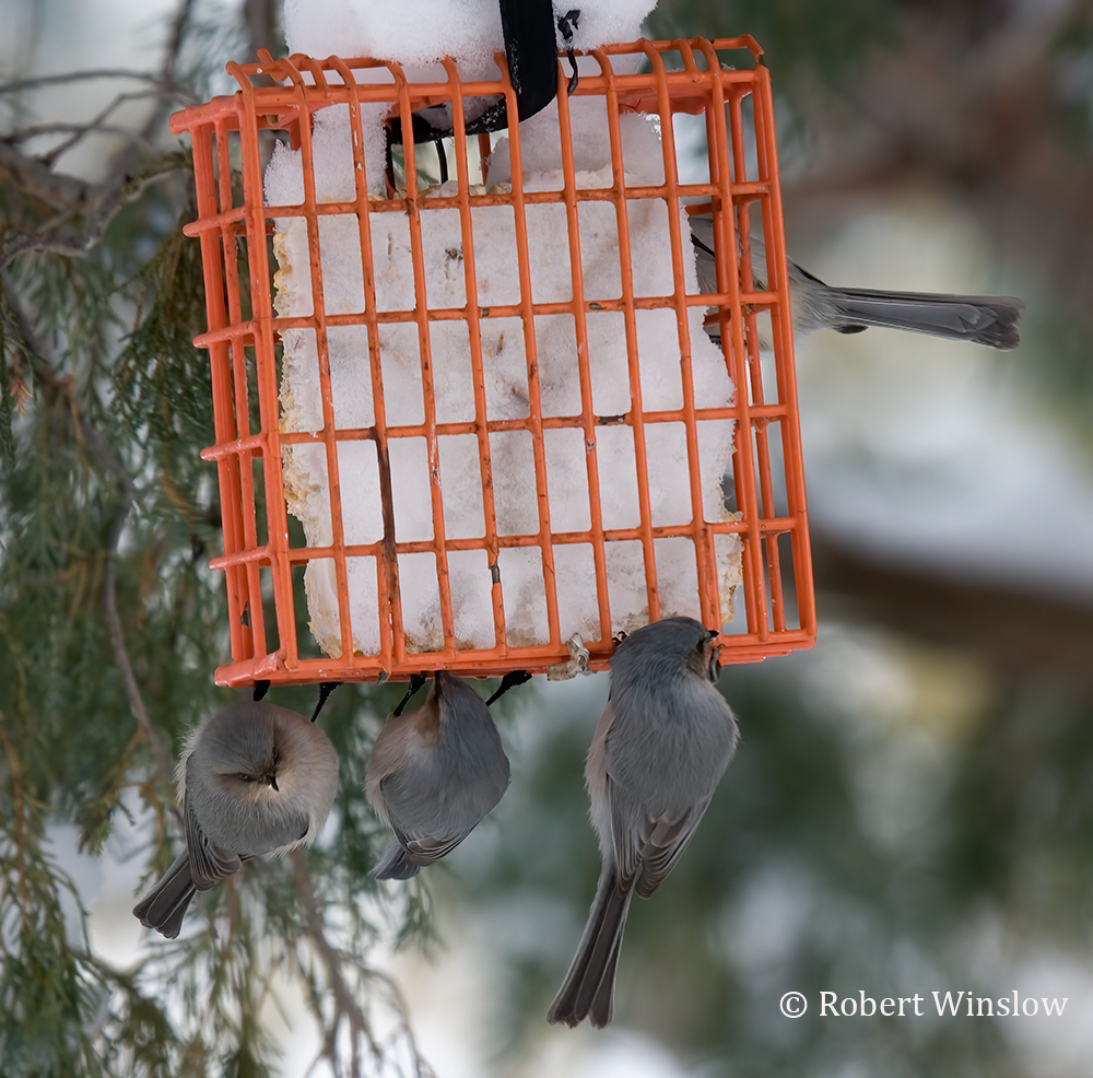 American Bushtit, Psaltriparus minimus, on a suet feeder, La Plata County, Colorado, USA, North America