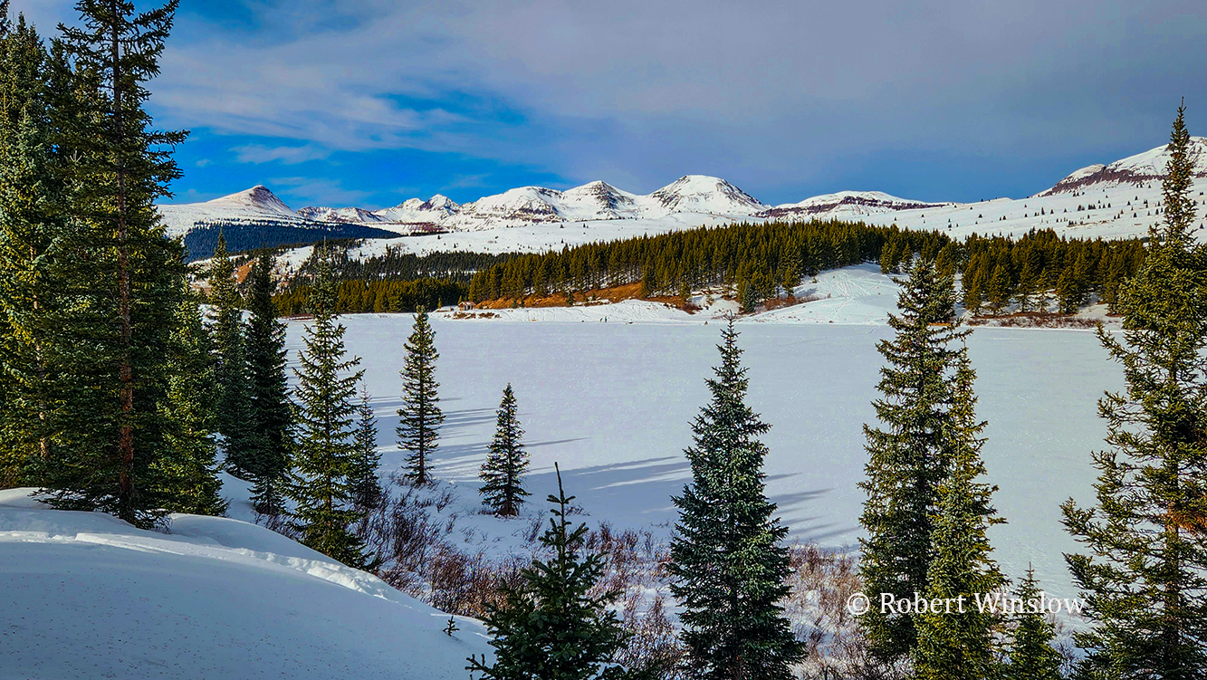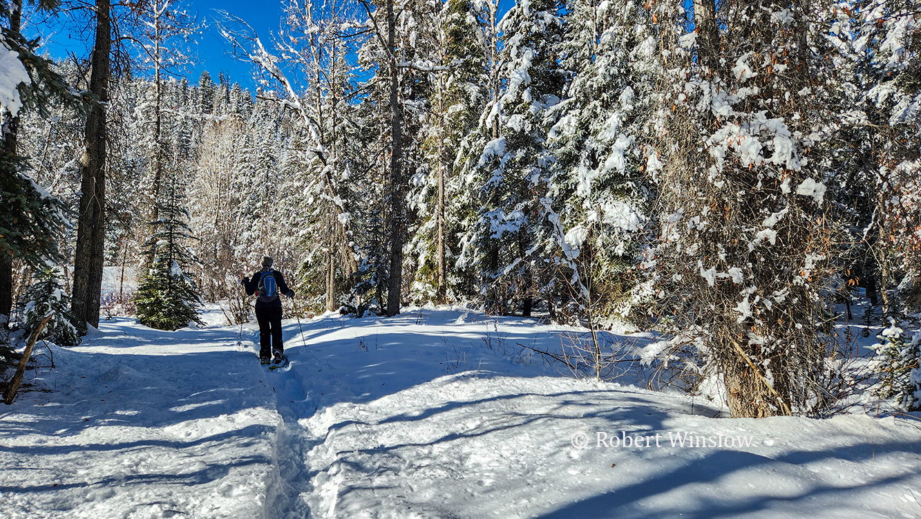 We found a beautiful quiet area to do some snowshoeing. The snow and bushes were covered in ice crystals, The trees were covered with snow. No wind. Colorado blue skies.