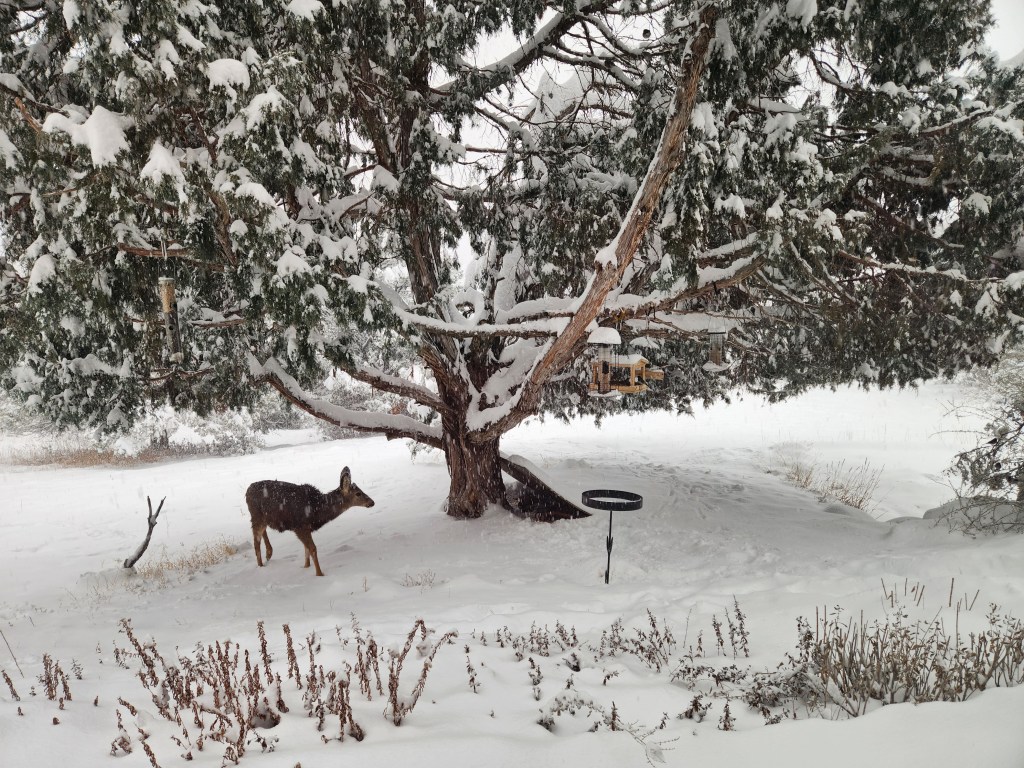 One photo was taken yesterday and the other photo today. Both were taken with my cell phone through the windows. The deer like to cruise by and eat some bird seed.